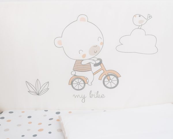 – Semi parachoques de cama de 35×180 cm compuesto por funda extraíble con cremallera y 3 piezas de relleno de espuma suave de 35×60 cm recubiertas de tela no tejida;