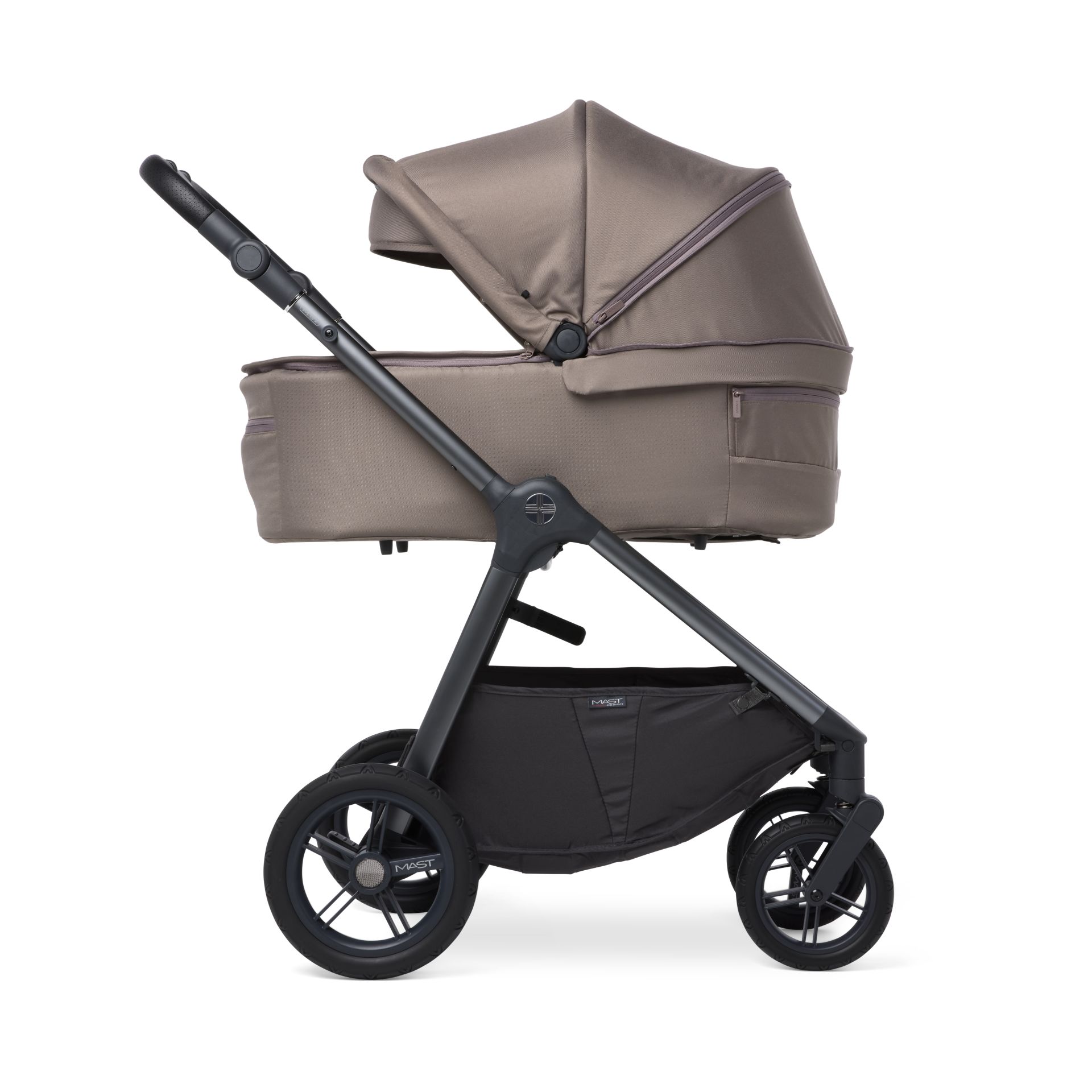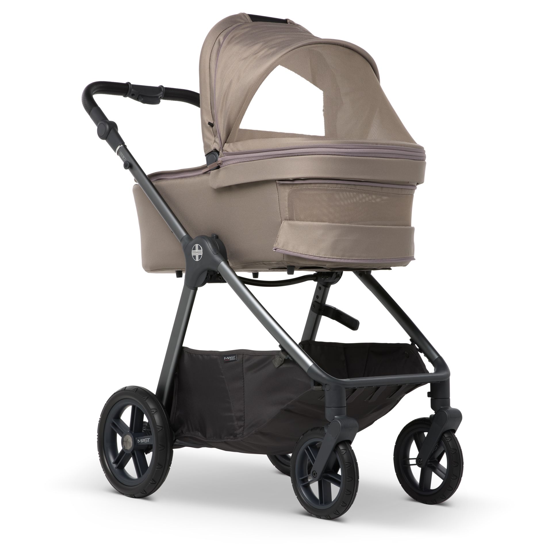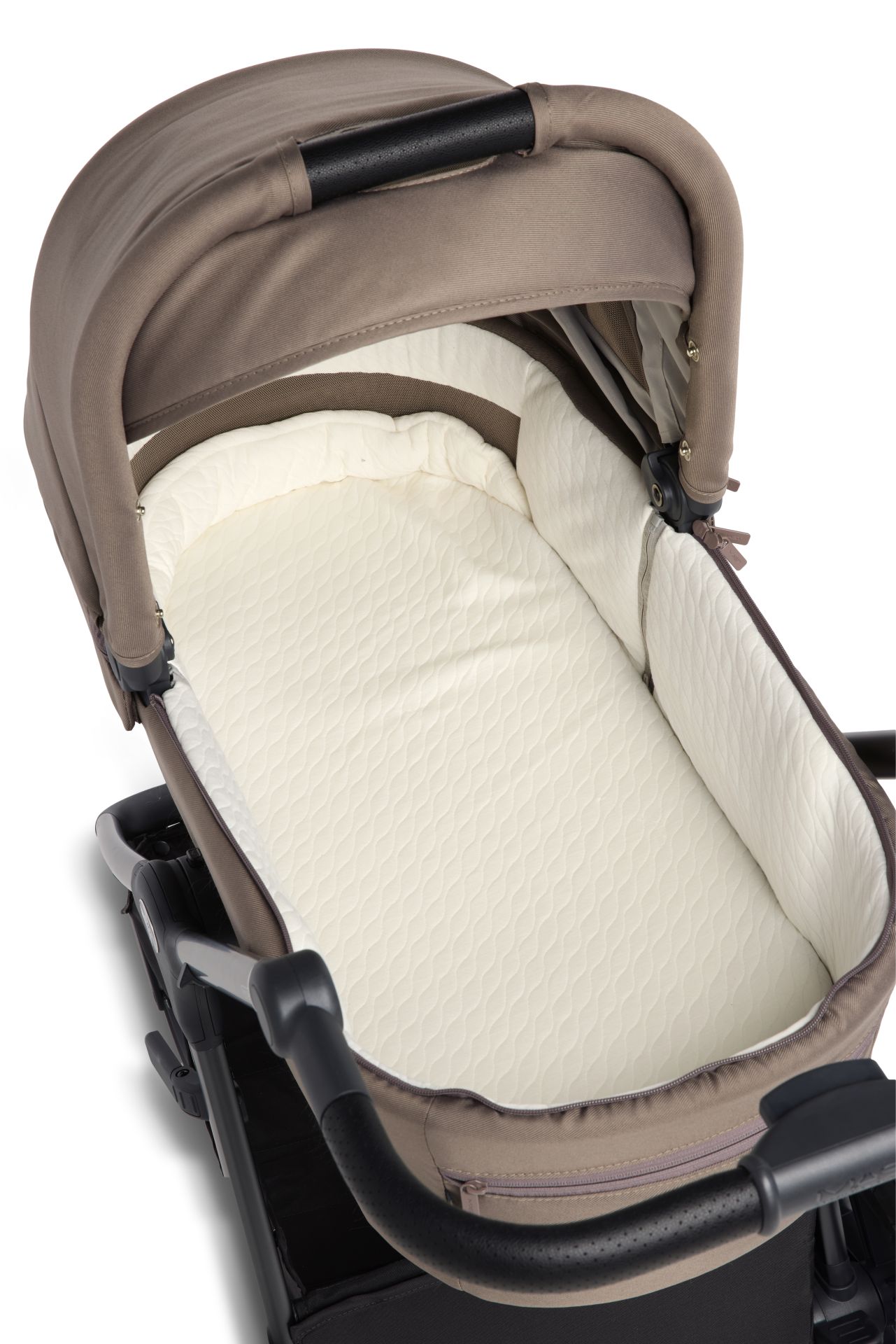 El capazo incluido en el M.5x viene con un colchón muy cómodo y transpirable. Esto garantiza un sueño relajante y seguro. El capazo está bien ventilado para asegurar una circulación óptima del aire. Puedes abrirlo por la parte inferior, por la capota y por la parte de la cabeza. La malla anti-UV integrada proporciona protección adicional contra los rayos solares dañinos. Con las diferentes posiciones de la capota, puedes proteger a tu hijo de la luz intensa o de condiciones meteorológicas molestas. El capazo se puede instalar fácilmente al chasis del cochecito con los adaptadores incluidos y volver a quitar con los botones de memoria.