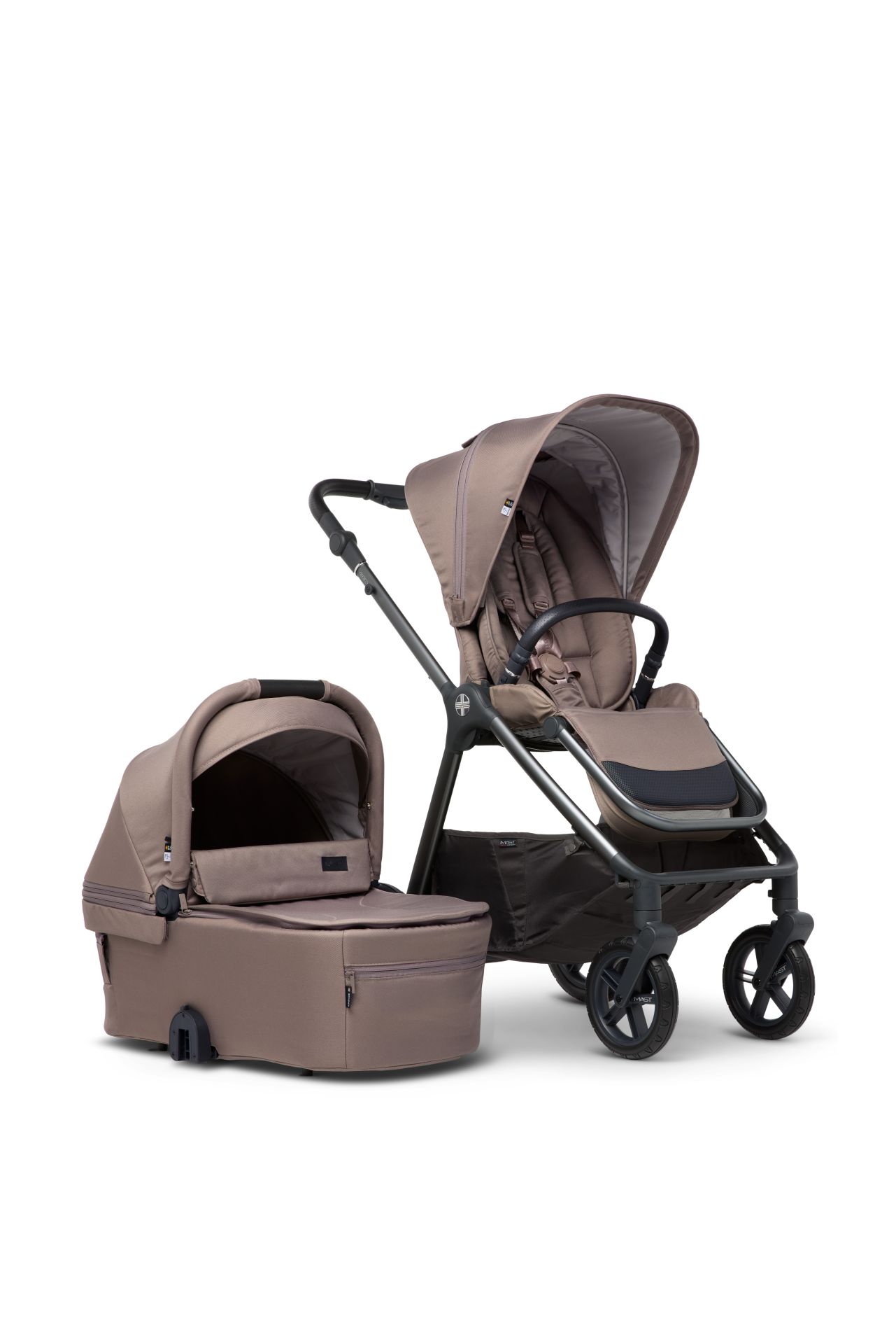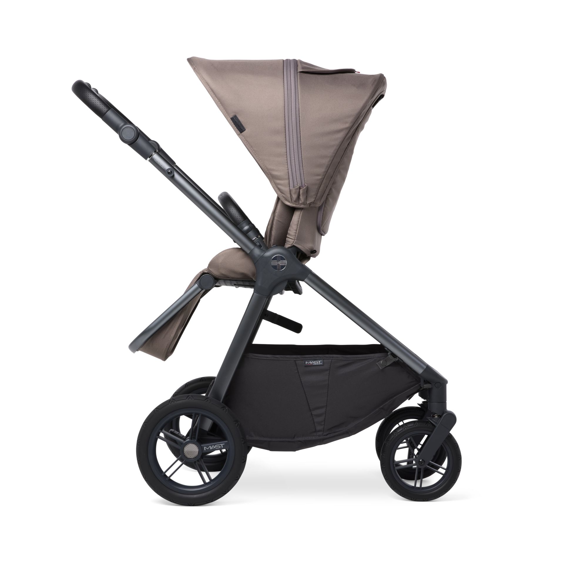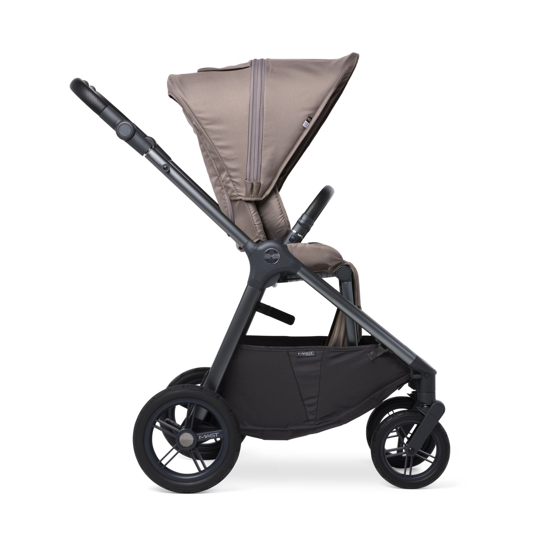 El cochecito M.5x cumple todos vuestros deseos. Incluidos en la entrega están el capazo para bebé, el asiento reversible y una amplio plástico de lluvia para ambos accesorios, que también protege la cesta. El M.5x se puede plegar completamente plano, permanece de pie cuando está plegado, independientemente de la dirección del asiento en el cochecito.